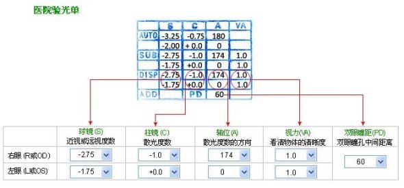 在上表中,右眼近视150度,合并近视散光75度,散光轴位是180度,戴眼镜后的矫正视力是1.0;左眼近视200度,合并近视散光100度,散光轴位是175度,戴眼镜后的矫正视力是0.8。